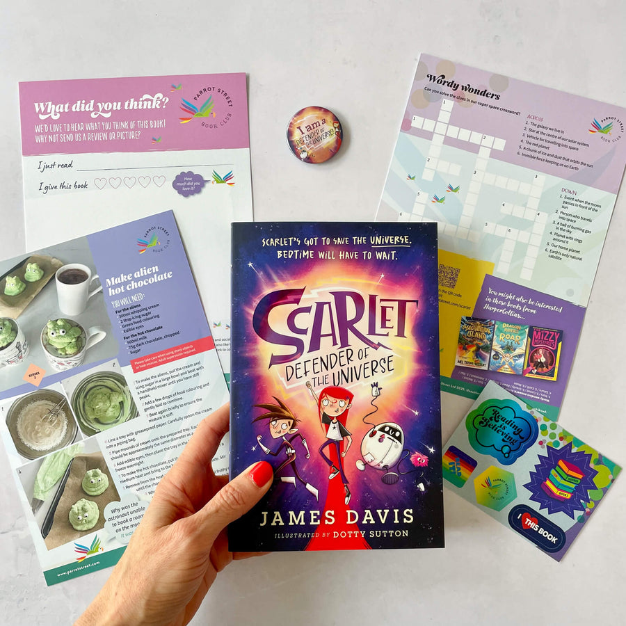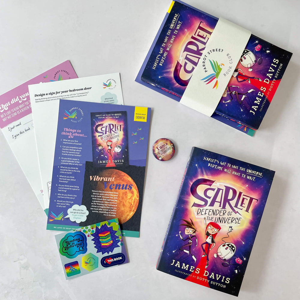 Young readers will laugh out loud at Scarlet: Defender of the Universe by James Davis, plus they'll have fun with the accompanying activity pack, which we created for Parrot Street Book Club subscribers in March 2025.
