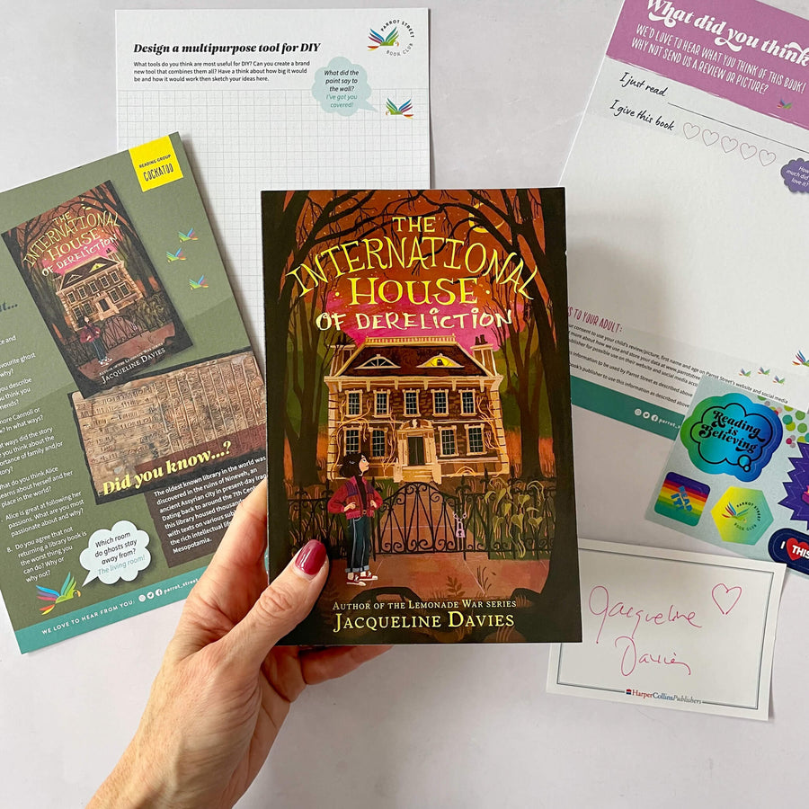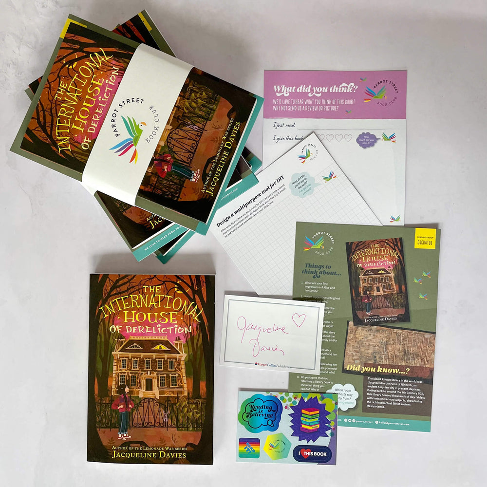 Young readers will be intrigued by The International House of Dereliction by Jacqueline Davies, plus they'll have fun with the accompanying activity pack, which we created for Parrot Street Book Club subscribers in October 2024.